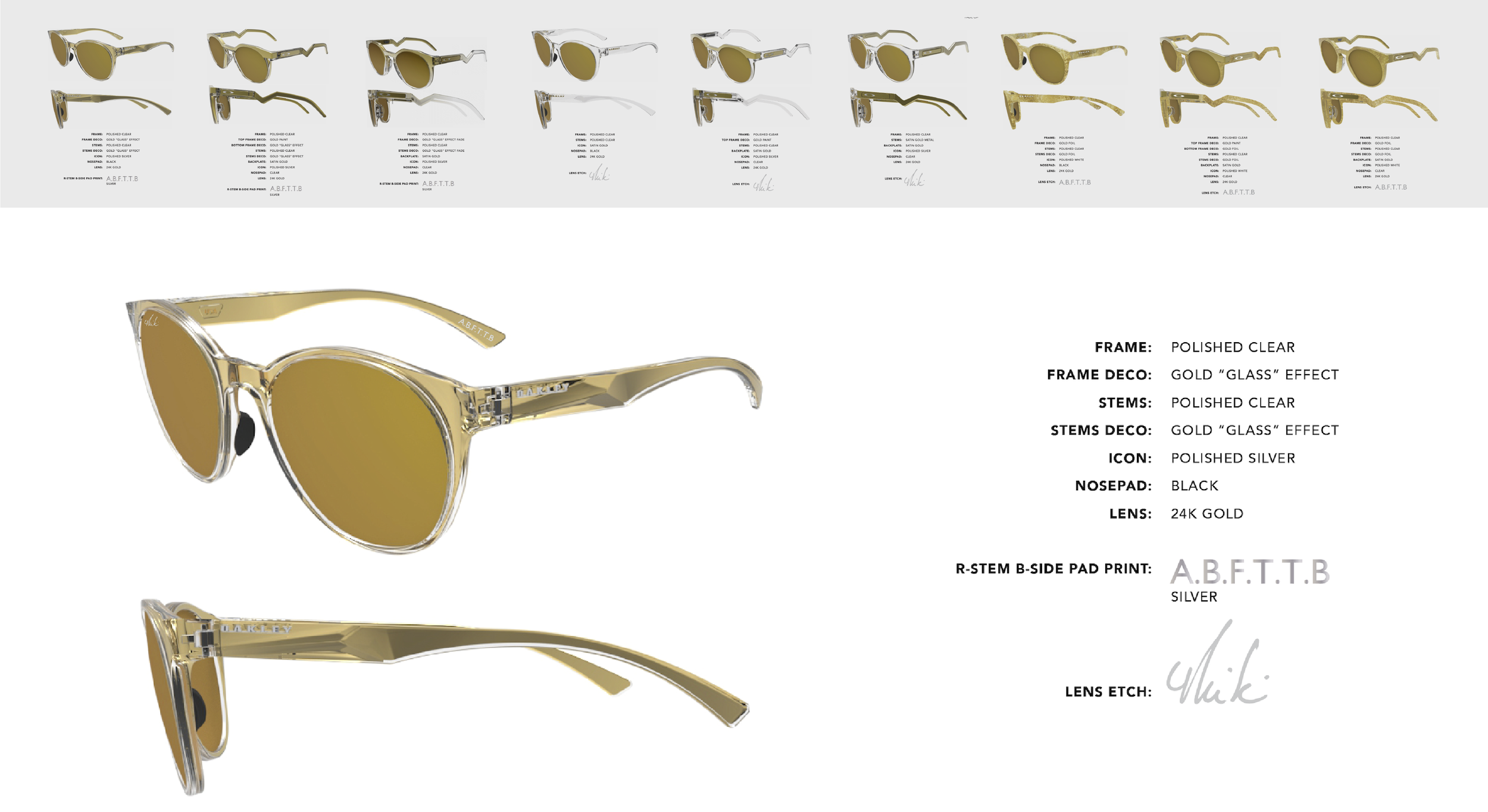 DESIGN: Gold was the only way to go for Mikaela. Several gold options were explored and a glass effect was created by painting the B-side of clear resin to give the stems and frames dimension and depth.